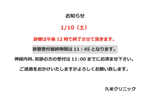1/10日(土)の診療は午後12時で終了させて頂きます